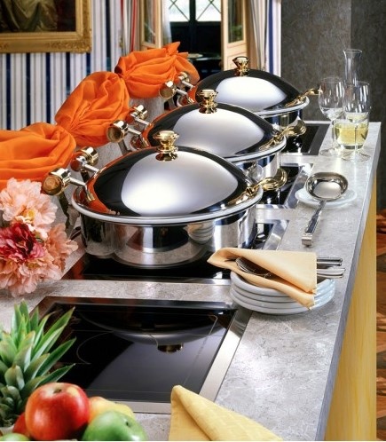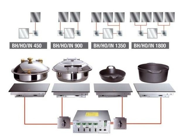 Induction heat retaining unit to keep dishes warm with Chafing Dishes. Continuously, precisely to the degree and electronically controlled temperature control from 50 °C to 100 °C.