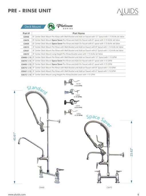 C8468 - 8″ Center Deck Mount Pre-Rinse -1.15 GPM with Wall Bracket and Add on Faucet with 12″ Spout
